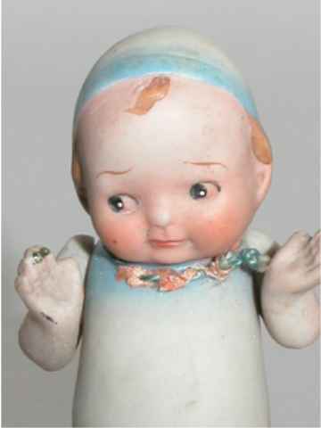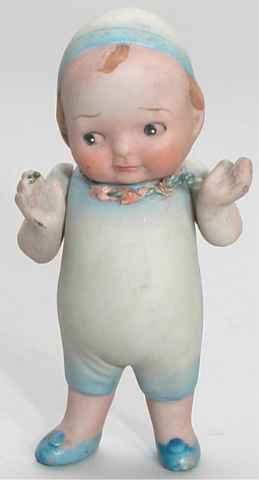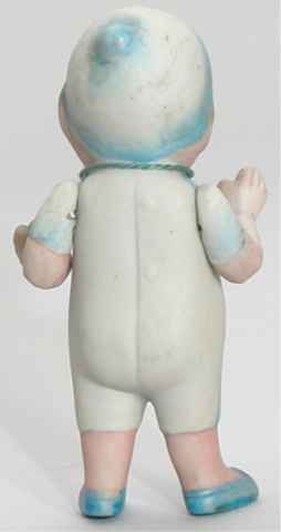 HE HAS NO MARKING AND I TOOK THE STRING OFF AND THERE IS NO DAMAGE UNDER NEATH IT. HE IS NOT QUITE 4 INCHES TALL. HE HAS NO DAMAGE TO THE BISQUE JOINTED AT THE ARMS. |