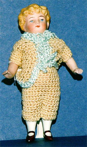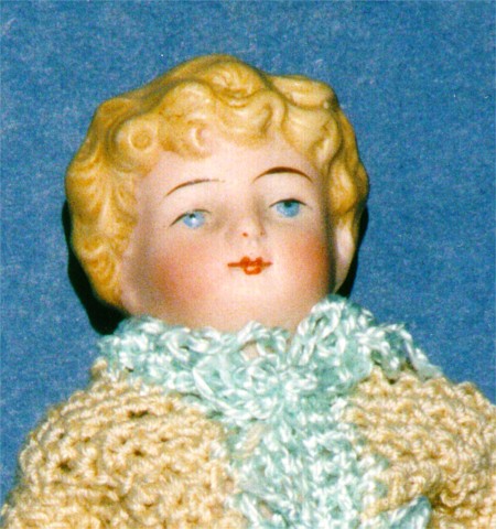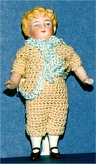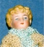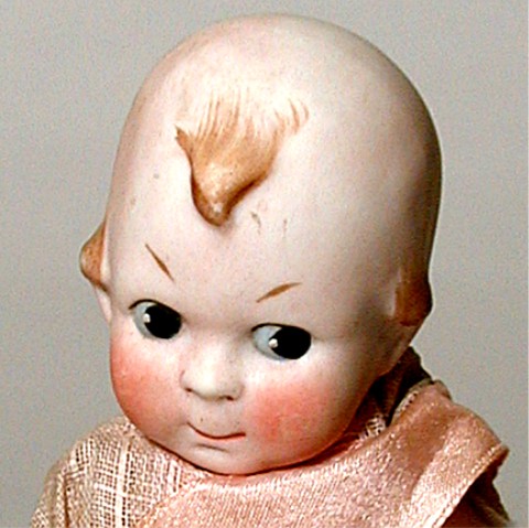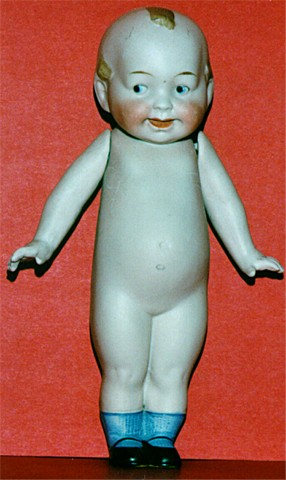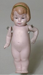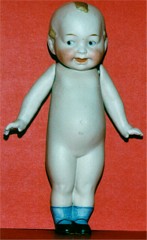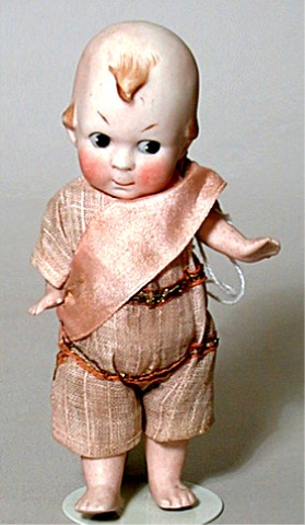 All bisque marked 10383. Sold by Butler Brothers from 1916. This "Cupid" was competition for "Kewpie. Well painted. Jointed at the arms & legs. 5 1/2 inches tall. The small black marks on top of head seem to be fired into the bisque when doll was made. |