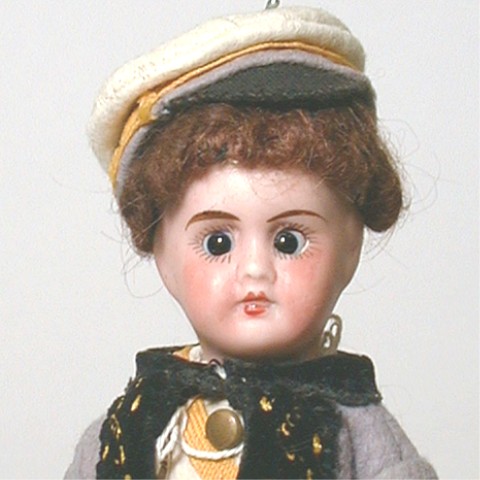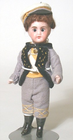 All bisque soldier. Swivel neck, all original, 7 1/2 inches tall. Jointed at the arms & legs. Brown sleep eyes. |
