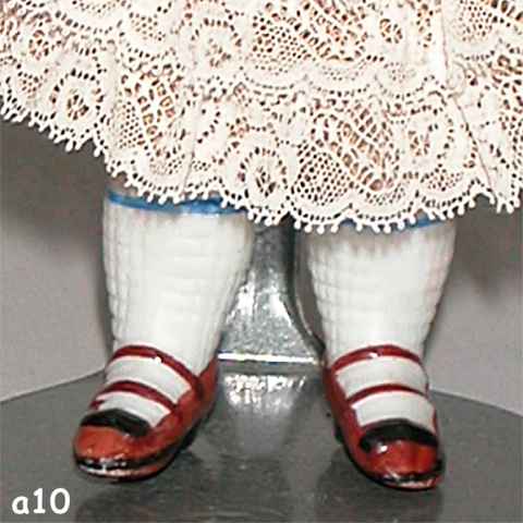 EARLY STYLE 5 INCH. BLONDE MOLDED HAIR, PAINTED EYES, JOINTED AT SHOULDERS & HIPS. SMALL CHIP AT STRING HOLE RIGHT LEG. |