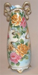 12 1/2 inch tall unmarked Nippon type vase. No cracks or chips. Some ware to gold on top of handles.