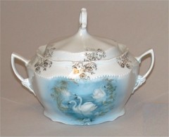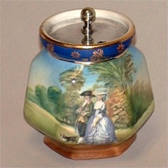 Jam Pot. 3 1/2 inches tall. Silver plate lid. Hand painted & decal combined. Made in Bohemia. Below ladies skirt signed "Gainsberoug"