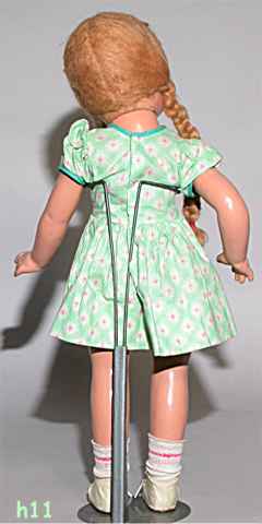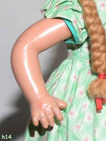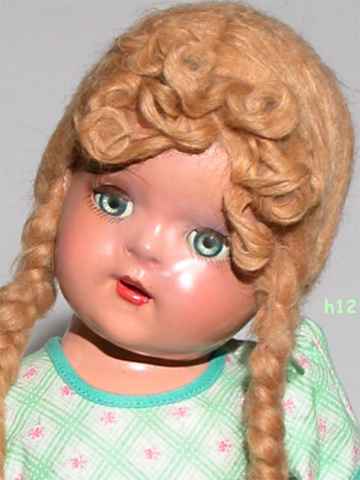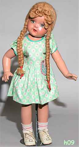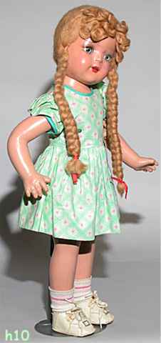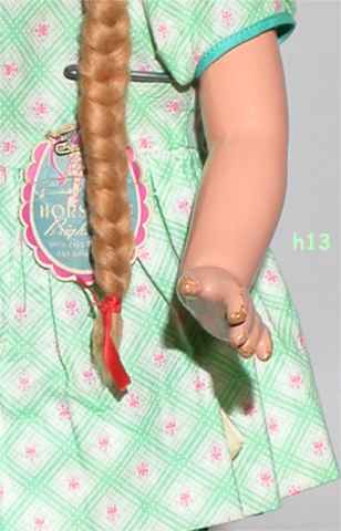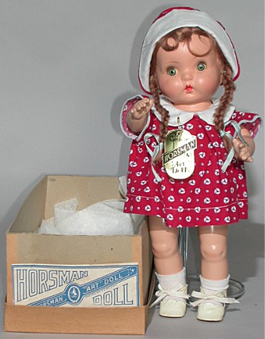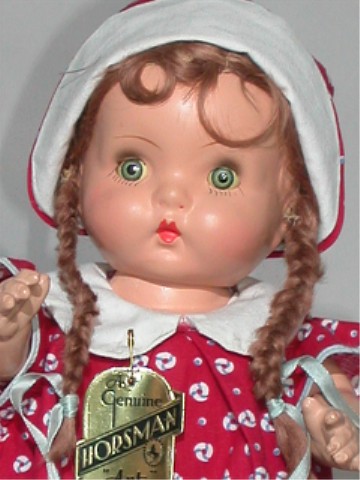 " BRIGHT STAR " "BRIGHT STAR" BY HORSEMAN. SHE IS ABOUT 20 INCHES TALLSHE WEARS HER ORIGINAL DRESS AND HAS A PAPER TAG. TAG READS HORSEMAN'S BRIGHT STAR WITH EYES THAT SHINEAND HAIR SO FINE. SHE IS IN GOOD CONDITION. SHE HAS A CRACK IN THE COMPOSITION NEAR HER EYE AND THERE IS SOME WEAR TO THE SHADOWING AROUND HER EYES. IF YOU LOOK AT THE PICTURES THE COMPOSITION APPEARS LIFTED AROUND HER NOSE. SMALL AMOUNT OF WEAR TO THE FINGERS.