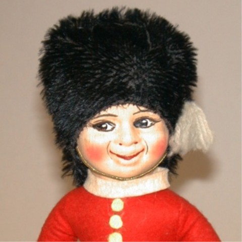 Chad Valley 12 inch English Guard. Painted eyes. Good condition. Label on his back. Hygienic toys made in England by Chad Valley Co. Ltd.