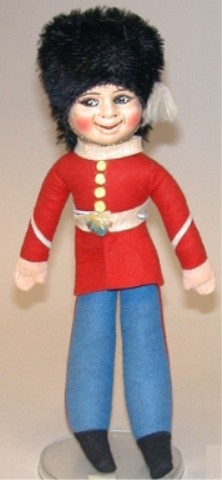Chad Valley 12 inch English Guard. Painted eyes. Good condition. Label on his back. Hygienic toys made in England by Chad Valley Co. Ltd.