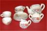 Doll Tea Set. 4 plates, one chipped. Creamer. Sugar bowl. 4 cups. Tea pot missing lid. As is
