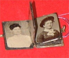 da109Miniature photograph album one inch by 3/4 inch. 6 tin type photos in side. |
