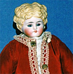 15 inch Bisque shoulder head. Molded blonde hair. Glass eyes, cloth body. leather lower arms.
