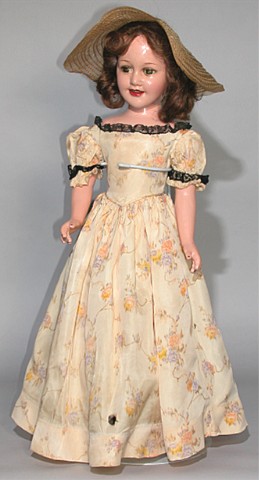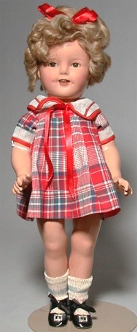 Shirley Temple 18 inches tall. Compo. by Idesl. Original dress not tagged. Marked head and body. Minor crazing. Very nice expression, eyes are in very good condition. 1934 +