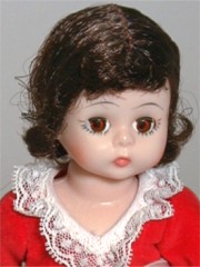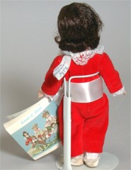 Madame Alexander Red Boy B.K. is 8 inches tall, hard plastic, Bent Knee, made in 1972. Wendy face. From the series Story land dolls. Red Boy is in very good condition. Still has wrist booklet. Red velvet out fit has no fading.