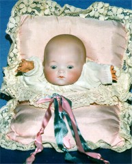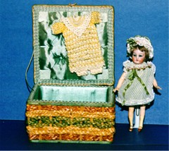 | 7 inch number 1078. Bisque, composition body. Early face, blue sleep eyes with wicker box as trunk.