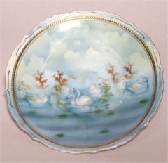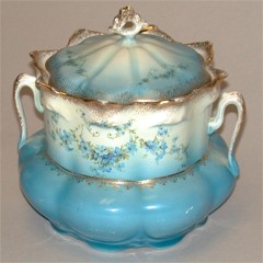 Jam Pot. 3 1/2 inches tall. Silver plate lid. Hand painted & decal combined. Made in Bohemia. Below ladies skirt signed "Gainsberoug"