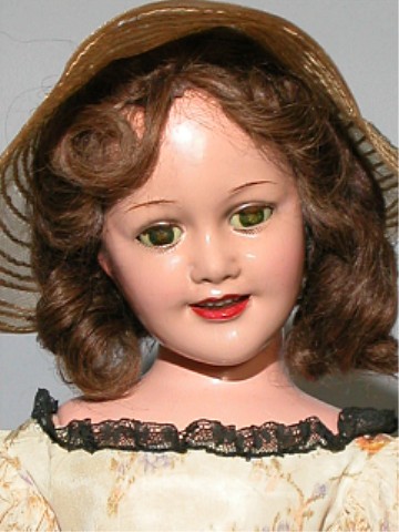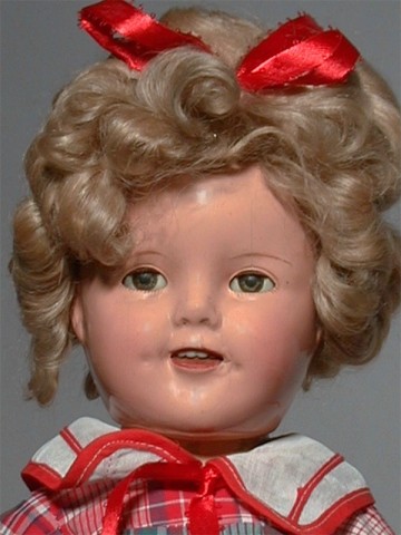 Shirley Temple 18 inches tall. Compo. by Idesl. Original dress not tagged. Marked head and body. Minor crazing. Very nice expression, eyes are in very good condition. 1934 +