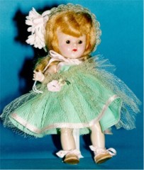 SOLD Vogue Jan doll is 10 inches tall all vinyl. Finger nail paint all there. Dress is tagged Vogue Dolls. Shoes original, one elastic on right shoe has been sewn together on black eleastic. Original ear rings. Sleep eyes. I mended the netting on the separate under slip, other wise its in great shape. Color is good on Jan. Comes from a smoke free home. |